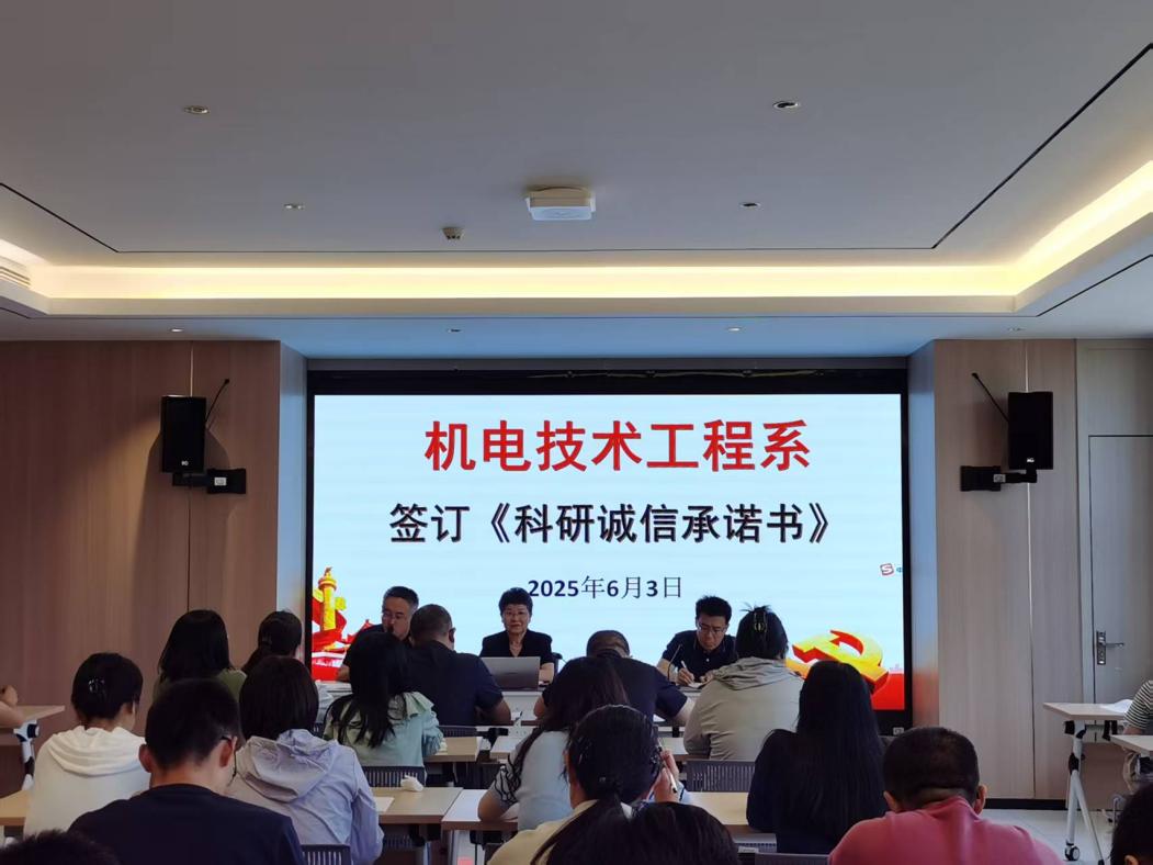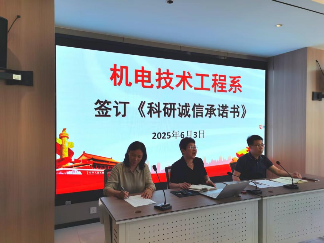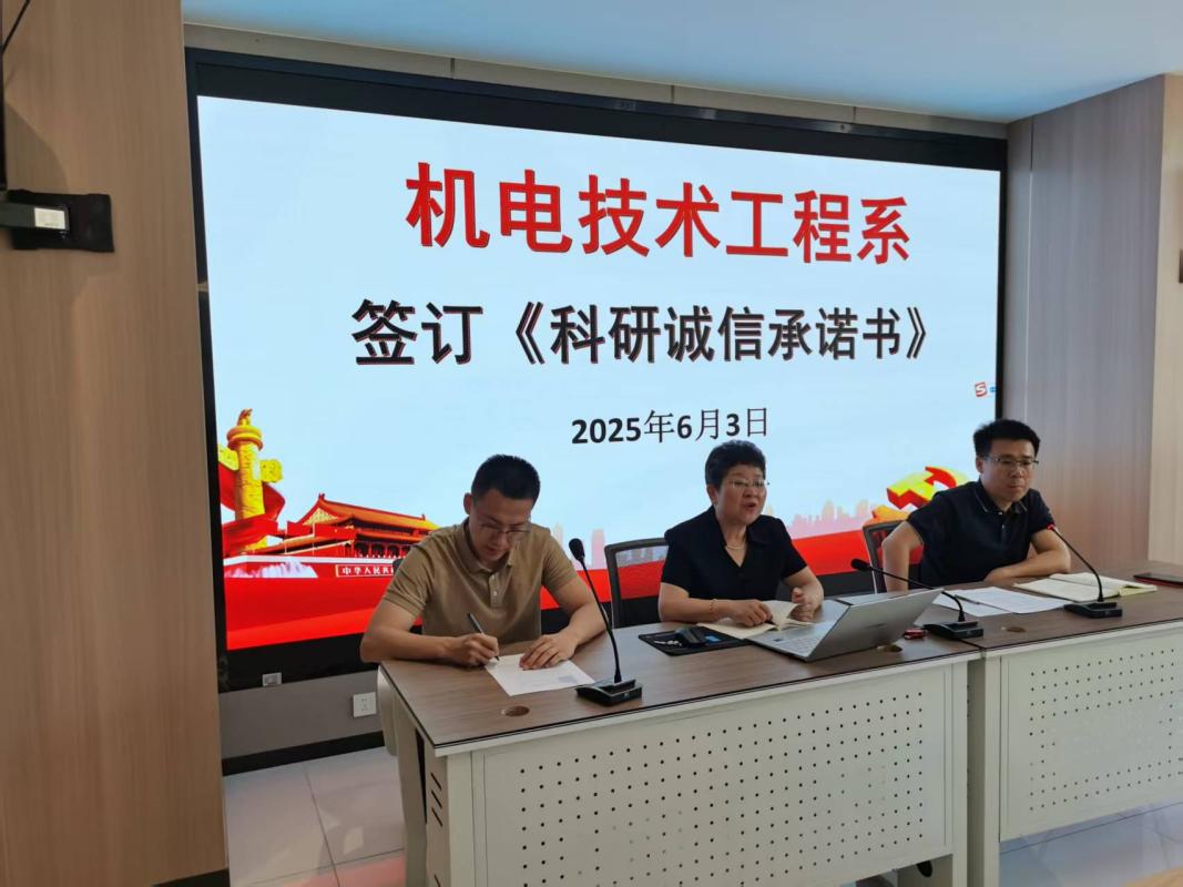 为进一步加强科研诚信建设,营造风清气正的学术环境,2025年6月3日,机电技术工程系全体教师齐聚一堂,举行了庄重的《科研诚信承诺书》签订活动。本次活动由机电技术工程系副主任张海鹏主持。