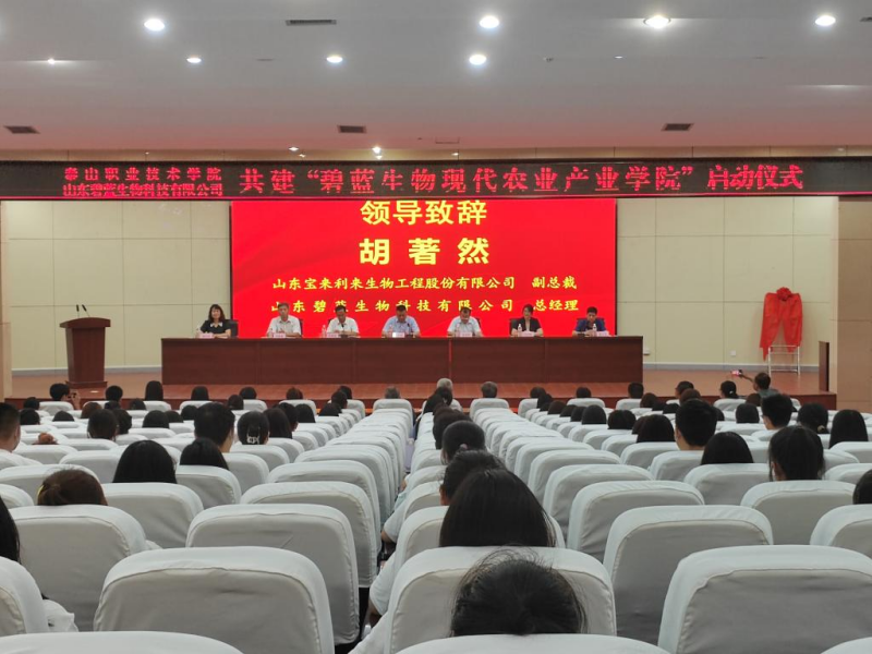 6月8日上午,学院与山东碧蓝生物科技有限公司共建碧蓝现代农业产业学院启动仪式在图书馆报告厅举行。山东宝来利来生物工程股份有限公司副总裁、山东碧蓝生物科技有限公司总经理胡著然,山东宝来利来生物工程股份有限公司副总裁、人力资源总监兰江华出席本次活动。学院党委书记张勇华,学院党委副书记、院长崔耕虎,党委委员、副院长李新林,党委委员、工会主席范玉文,党委委员、科研处处长赵京岚,生物系全体教师、学生代表参加此次活动。党委委员、工会主席范玉文主持启动仪式。