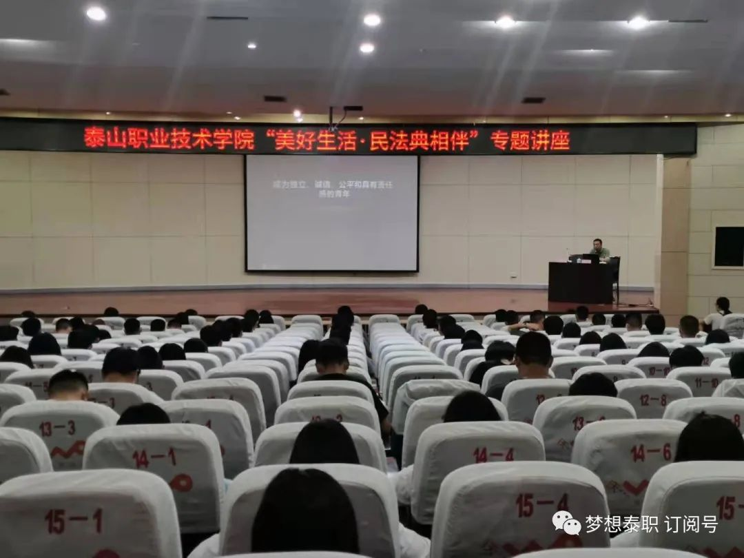 为引领全院学子深入学习《中华人民共和国民法典》,强化法律意识,做到知法、守法、知法爱国,泰山职业技术学院邀请李海波教授在我校开展了“美好生活,民法典相伴”专题讲座,在本次活动中李海波教授为我们讲述了民法典是我们从事各行各业、生产生活的行为准则,是社会生活的百科全书。