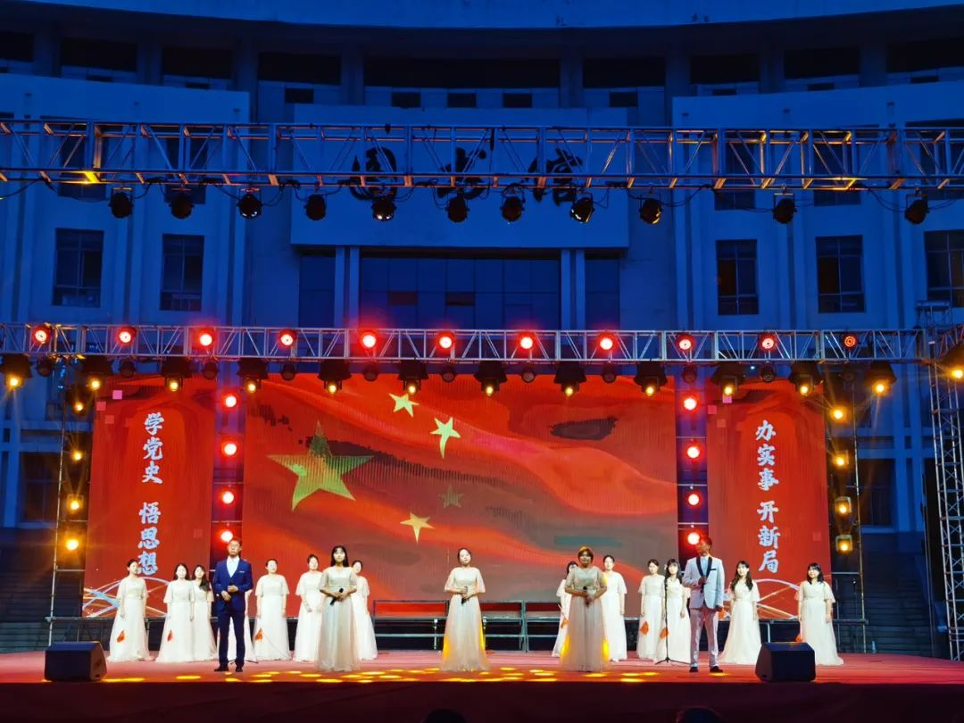 随着激昂深情的歌声响起,文艺晚会在歌曲《唱支山歌给党听》中拉开序幕。一支激情澎湃的歌曲,带领现场观众回顾建党百年辉煌历程,表达对党和祖国的忠诚和信仰,以及对祖国的美好祝福。“征途漫漫,惟有奋斗”,我们坚信,在中国共产党的正确领导下,我们一定会尽早的实现中华民族的伟大复兴,让我们为国家的发展不断奋斗和努力吧!心的党中央坚强领导下,中国特色社会主义进入新时代,昂首阔步迈向全面建设社会主义现代化国家的新征程。
