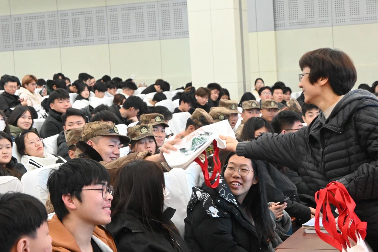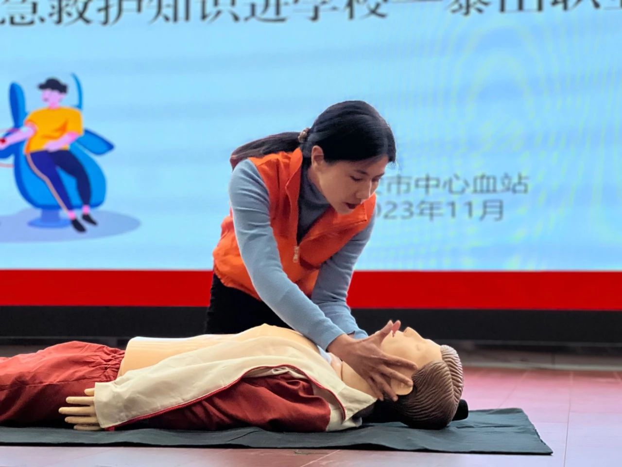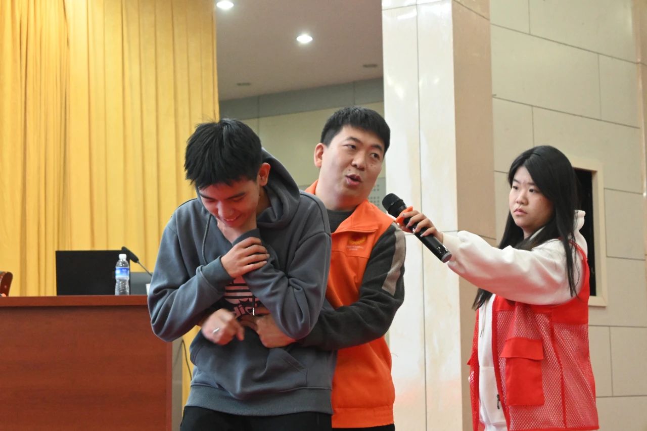 讲座中,曲小娜着重讲解了献血救人的深远意义,无偿献血报名条件、基本要求,献血前中后的注意事项,以及献血者优先用血和“四免政策”等优待政策,并与大家进行了现场互动问答。随后,李彬为同学们开展了应急救护培训,现场演示并组织同学们进行了心肺复苏术和海姆立克急救法等急救技能的模拟操作。