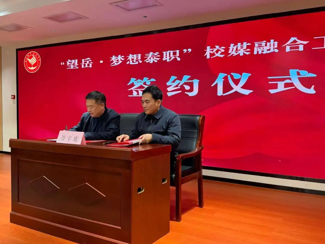 崔耕虎、何麦之共同为“望岳·梦想泰职”校媒融合工作室揭牌。泰安日报社党委委员、副总编辑车军,学校党委委员、宣传统战处处长曾晓东上台签约。“望岳”客户端运营中心副主任秦承娇介绍工作室建设思路。