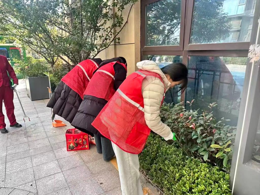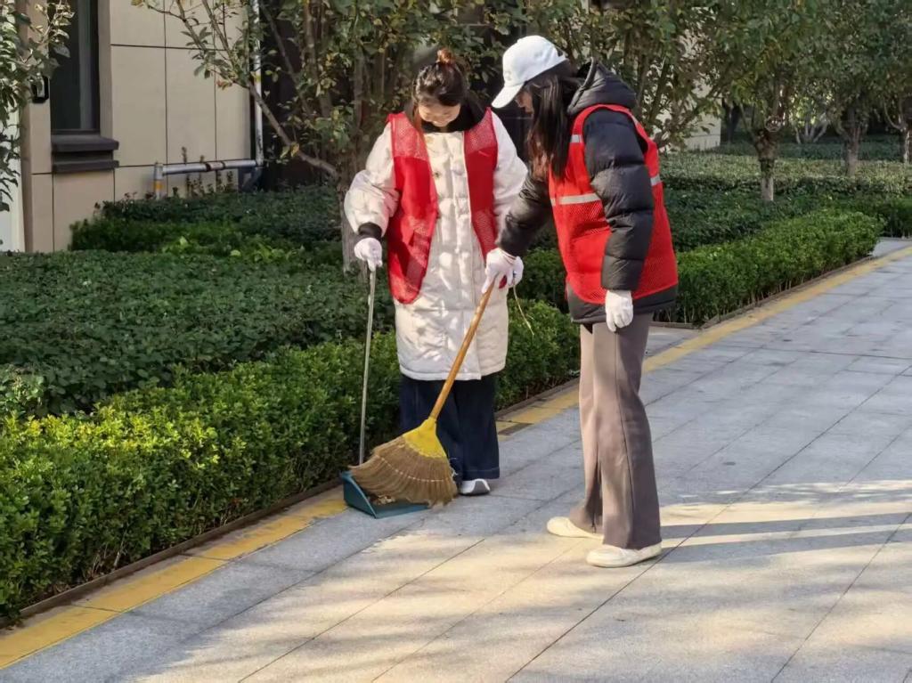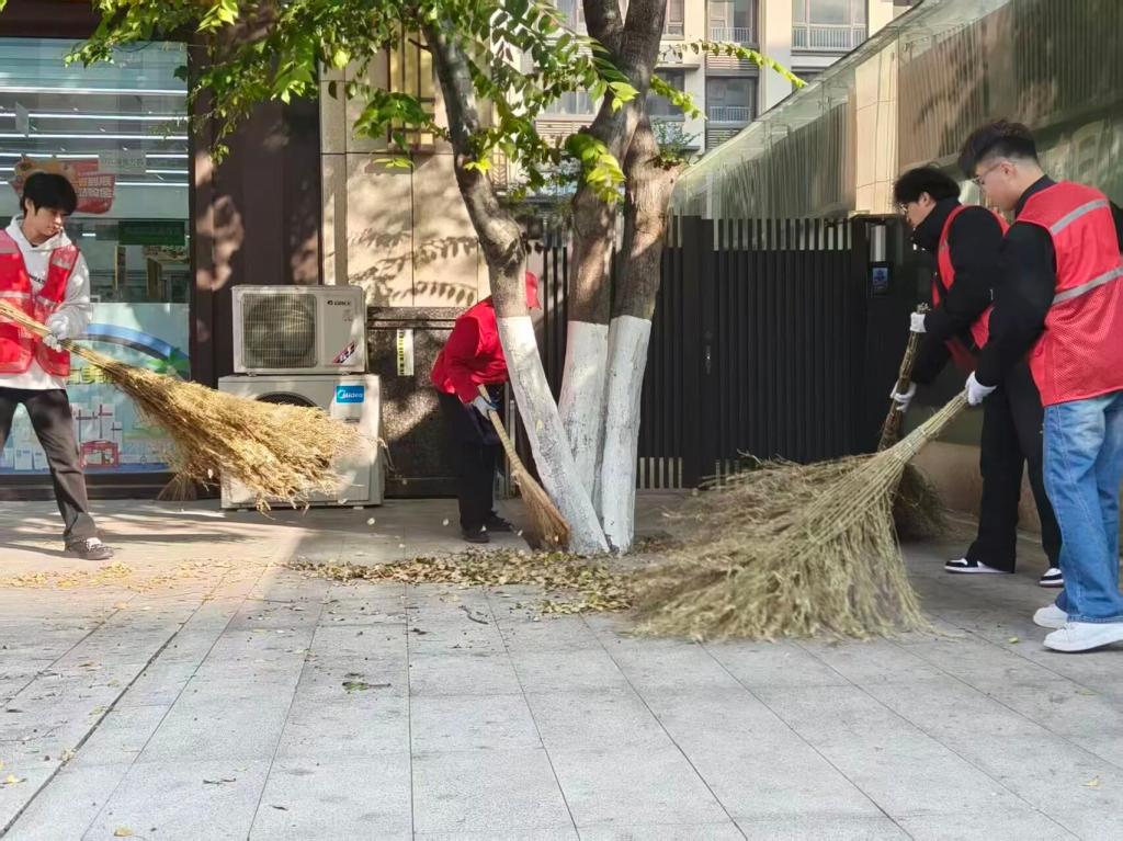 志愿者们热情高涨,在物业工作人员的引导下迅速投入工作。有的手持垃圾袋,仔细捡拾小区道路、绿化带中的生活垃圾、烟头杂物;有的挥舞扫帚,认真清扫道路旁堆积的落叶,不放过任何一个卫生死角。大家分工协作、默契配合,弯腰、清扫、搬运,一系列动作有条不紊。尽管秋风微凉,但同学们的额角渐渐渗出汗水,却丝毫没有影响志愿服务的热情,一张张年轻的脸庞在阳光下闪耀着认真专注的光芒。