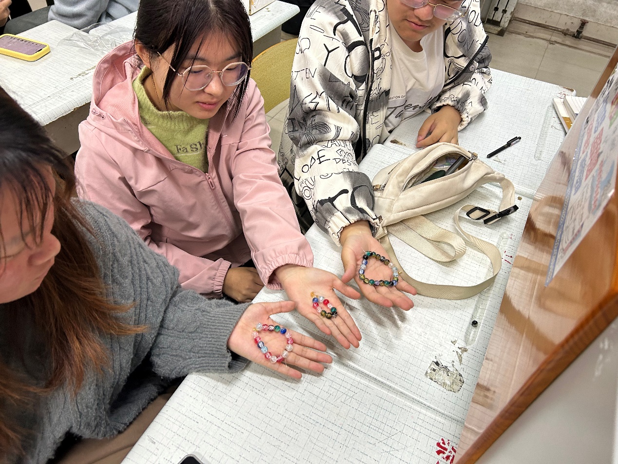 活动现场,各位同学们精选石头珠子、木质珠子、丝线等材料,一步步编织出蕴含深厚文化底蕴的祈福手串。每一颗珠子都承载着吉祥的寓意,每一次编织都凝聚着同学们深深的祝福。手串的完成,不仅是一件精美的饰品,更是情感与文化的传承。