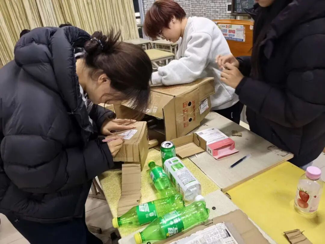 活动筹备阶段,同学们化身“环保创意家”,利用课余时间搜罗纸箱、塑料瓶可再生资源作为创作素材,在宿舍、教室等场所将废弃材料转化为一件件富有巧思的作品。有人用纸箱复刻地域旅游景观,有人将塑料瓶改造成旅行收纳工具;遇到难题时,大家分工协作,让每件作品都凝聚了独特的创意与精心的制作。