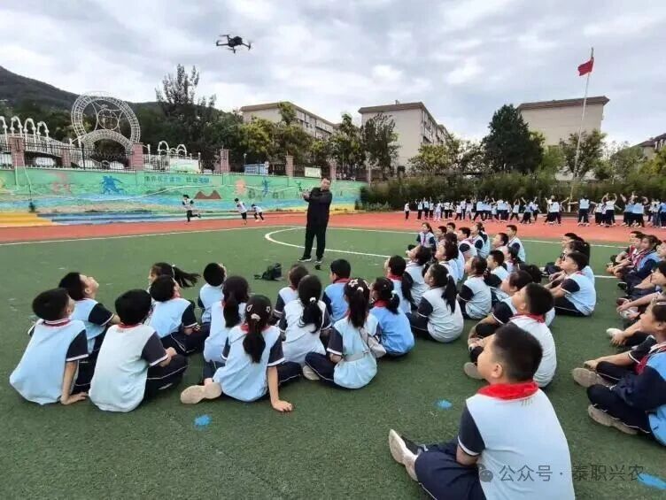 操场上,初金鹏老师带领同学们学习使用无人机。从基本原理到实际操作,同学们听得津津有味。在初老师的指导下,同学们还亲自操作感受无人机的飞行,脸上写满了兴奋与好奇。无人机起飞、盘旋、降落,每个动作都引起阵阵欢呼,科技的魅力在这一刻展现无遗。