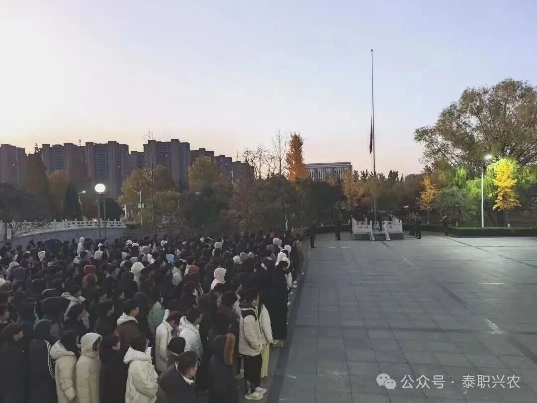 伴着晨光,护旗队以铿锵有力的步伐护送国旗入场,每一步都踏响“国旗至上”的信念节拍。国歌奏响时,五星红旗在致远楼前冉冉升起。全体师生庄严肃立、行注目礼,目光里是对空军英烈的崇敬,是对空天事业的向往——猎猎红旗在风里舒展,恰似空天卫士守护家国的赤诚,也映照着生物系学子的爱国热忱。
