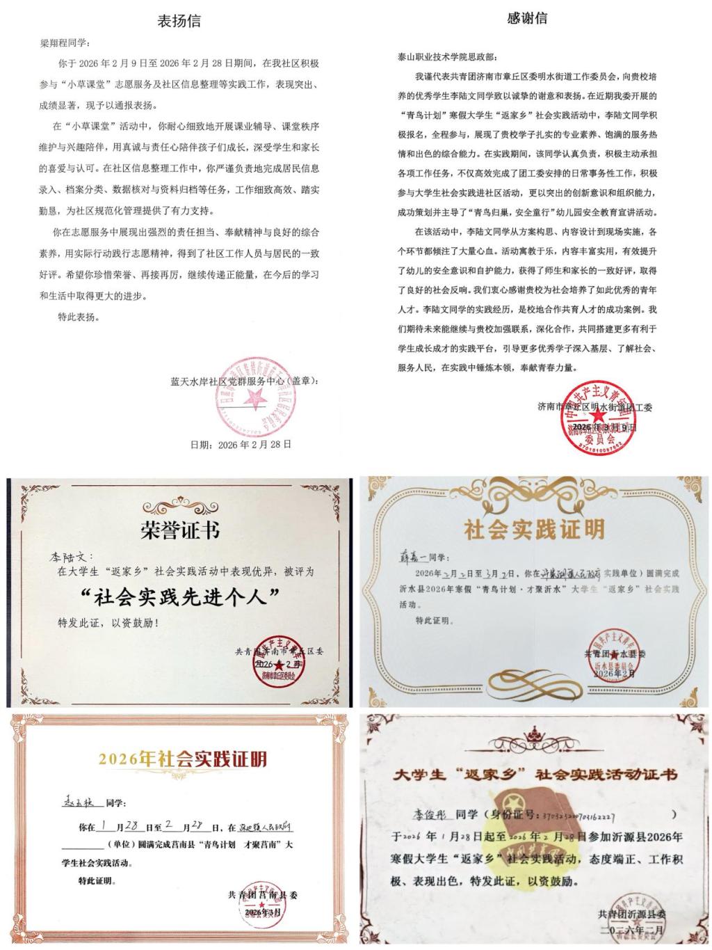 2025-2026学年寒假,思政部扎实推进实践育人工作,选派13名党务工作专业优秀学子参加“青鸟计划”,深入基层开展政务实习、社区服务及乡村振兴实践。新学期伊始,学生们陆续收到来自实践单位的表扬信与实践证明,实践育人成效显著。