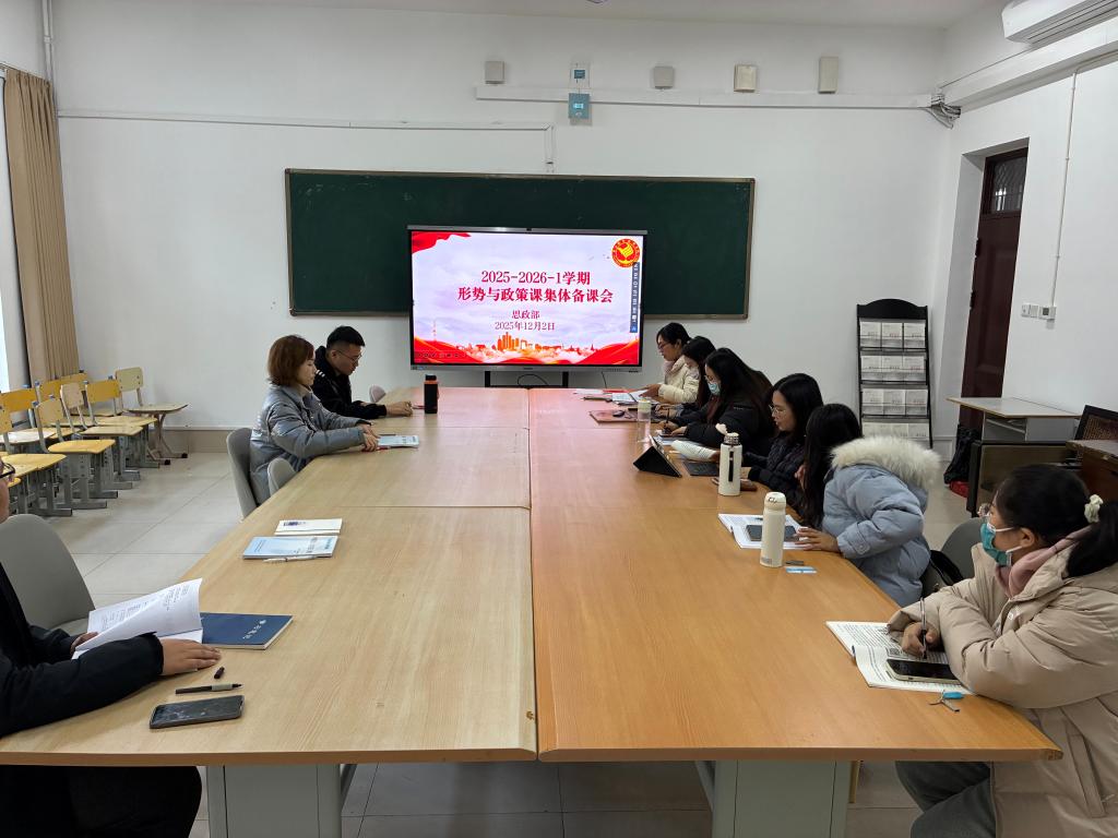 为深入学习贯彻习近平新时代中国特色社会主义思想,全面贯彻落实党的二十届四中全会精神,主动回应学生关切、解疑释惑思想热点,进一步提升“形势与政策”课教学质量,12月3日下午,思政部在明德楼212召开2025年秋季学期“形势与政策”课集体备课会。备课会由《形势与政策》课教研室主任高兴月主持。
