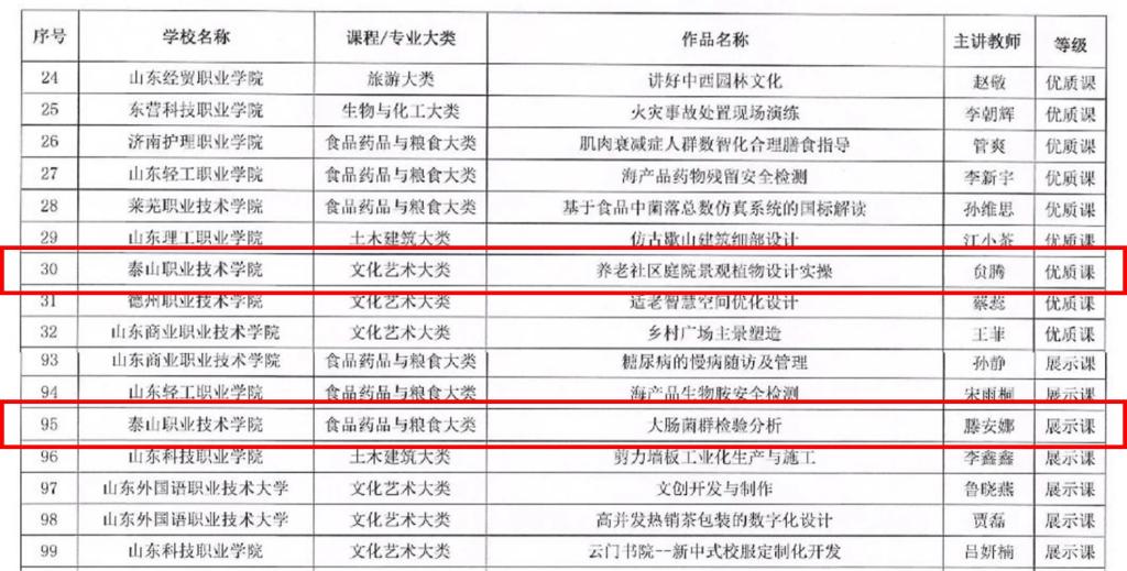 近日,山东省职业技术教育学会公布了2024年度山东省职业教育优质课培育线上展示作品评选结果,学校报送的2件作品《养老社区庭院景观植物设计实操》、《大肠菌群检验分析》入选。