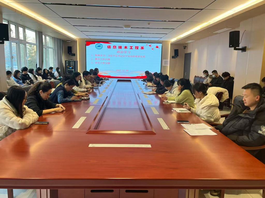 2025年12月9日下午,信息技术工程系于智能制造大楼C207会议室召开全体教职工会议,集中开展政治学习并部署教学与学生管理工作。会议由信息系副主任王树冰主持。
