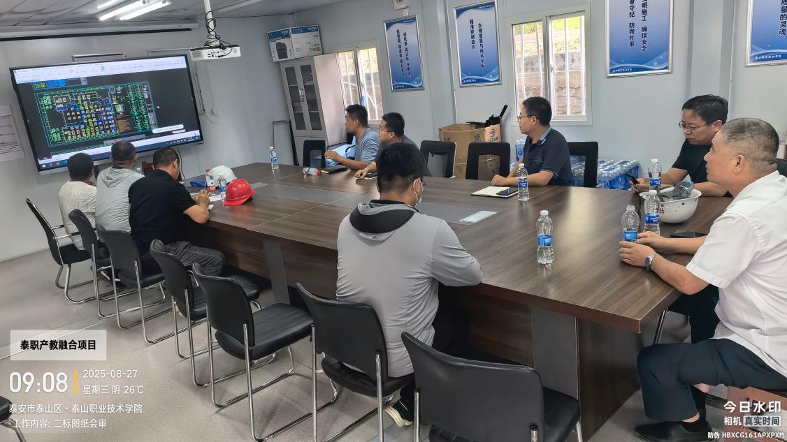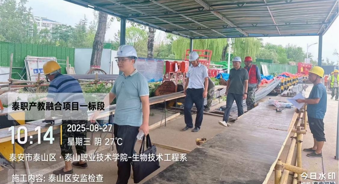2025年8月27日上午10点泰山区城市建设指导服务中心领导莅临泰山职业技术学院产教融合综合实训中心项目一标段工地检查工作。