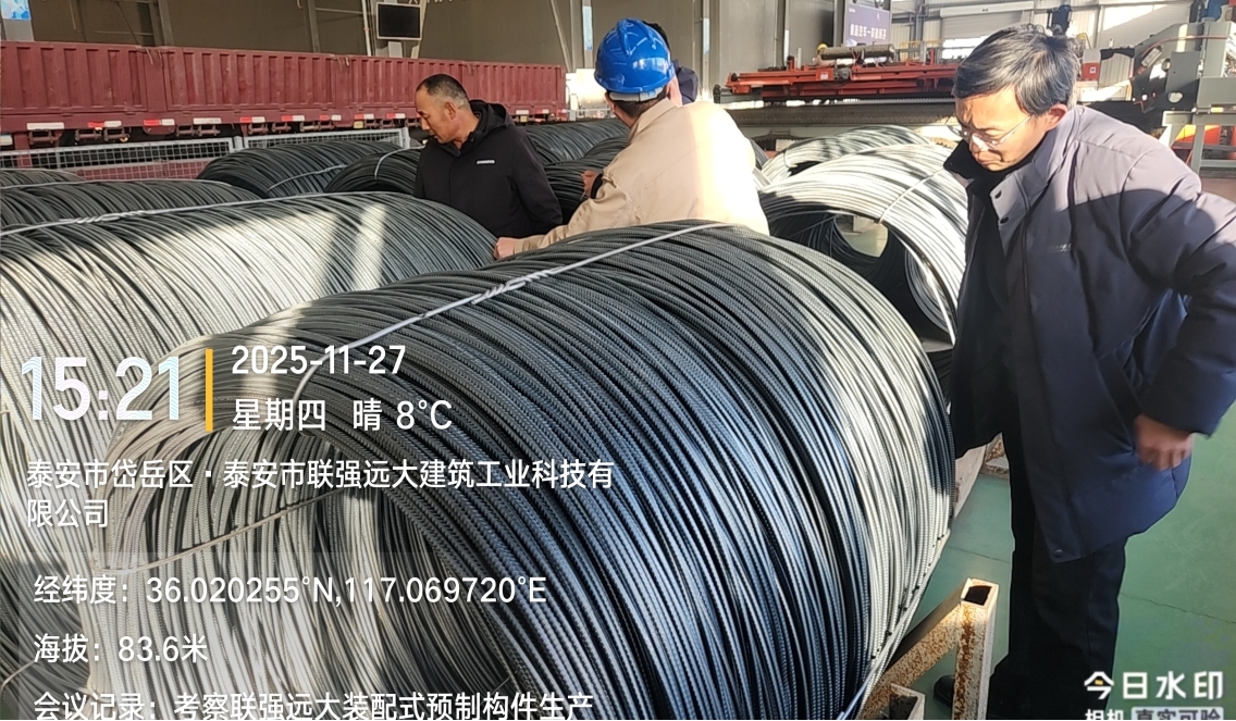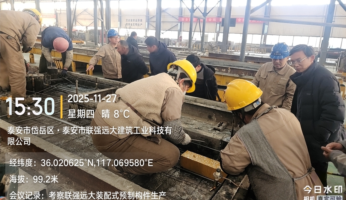 2025年11月27日下午3点总务处纪茂全科长、全过程咨询单位杨剑及三标段监理单位、施工单位项目负责人赴泰安市联强远大建筑工业科技有限公司考察三标段预制构件加工生产。