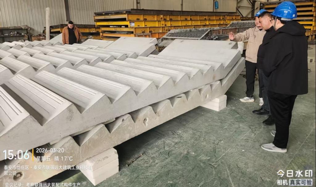 2026年3月20日下午3点全过程咨询单位设计总控杨剑及三标段总监一行赴泰安市联强远大建筑工业科技有限公司对预制构件生产进行巡查。